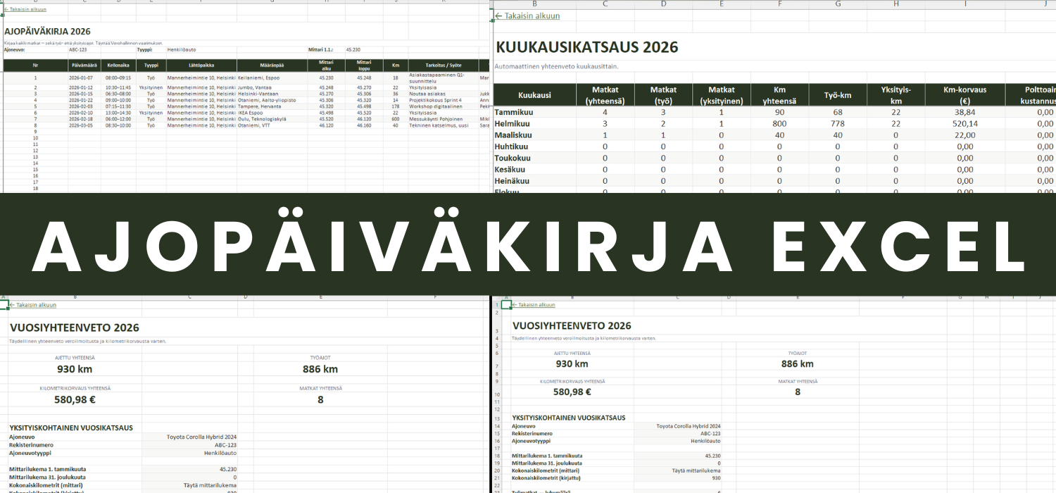 Ajopäiväkirja Excel pitää kirjaukset järjestyssä ja laskee vähennyspohjan automaattisesti – veroilmoitukseen valmis minuuteissa.