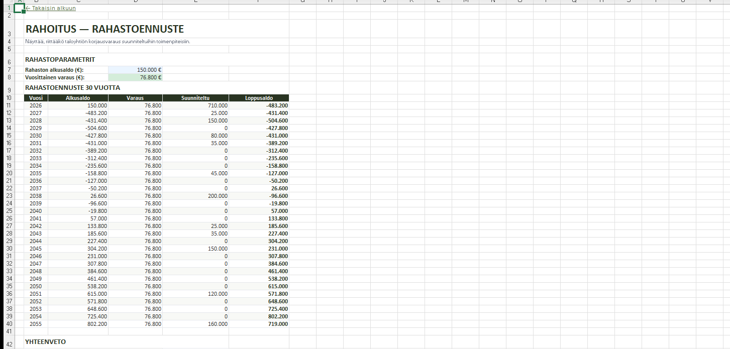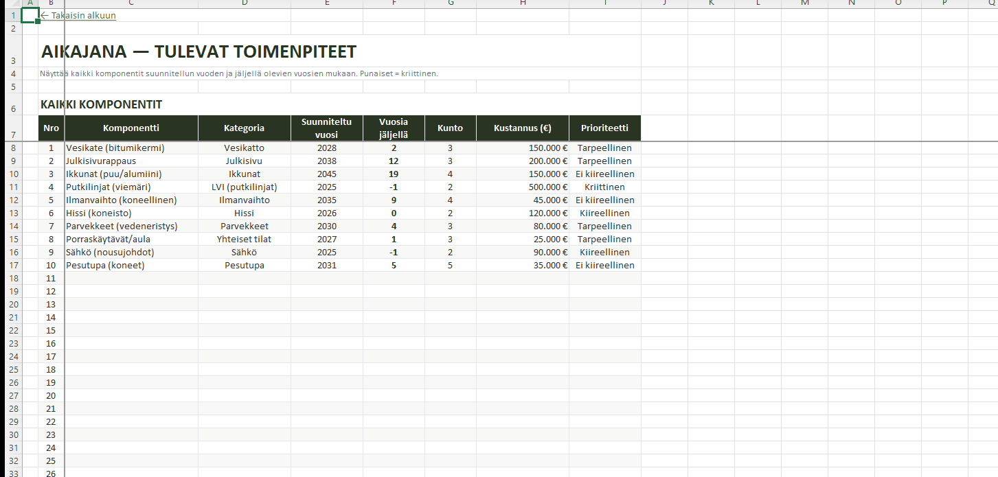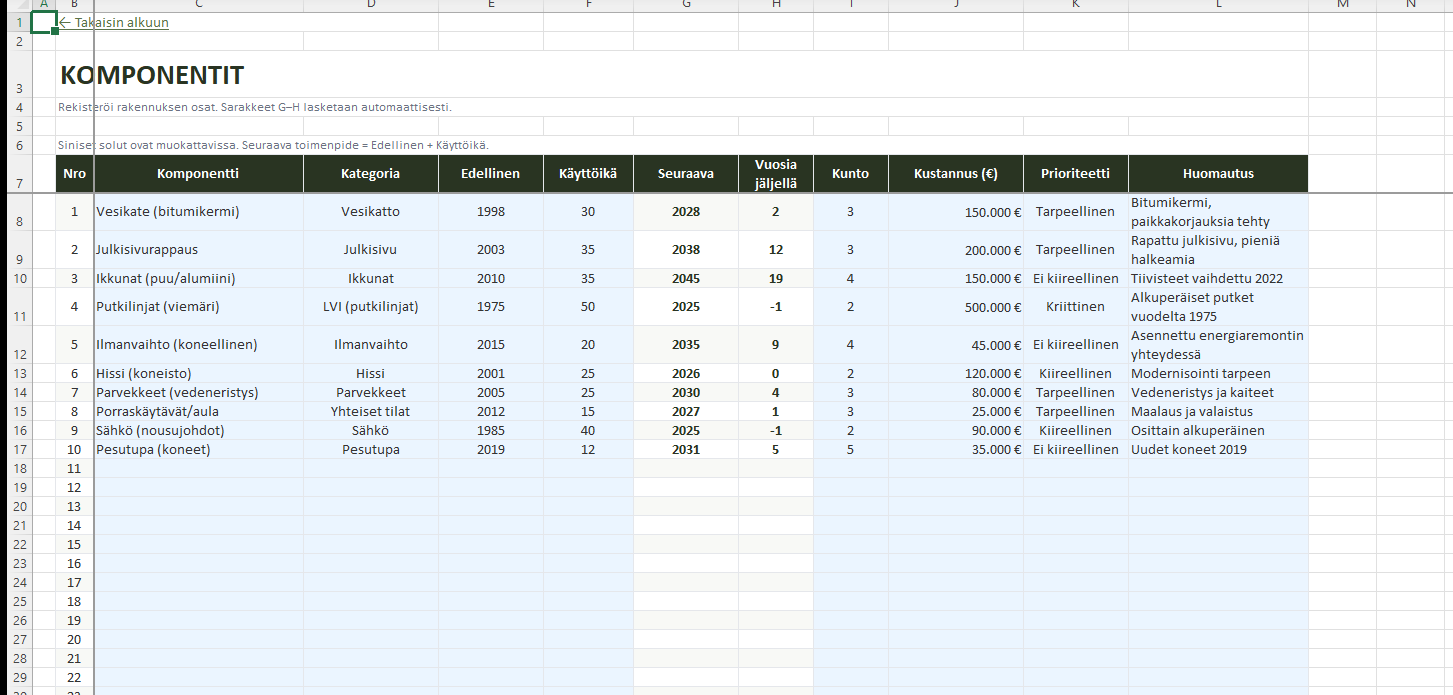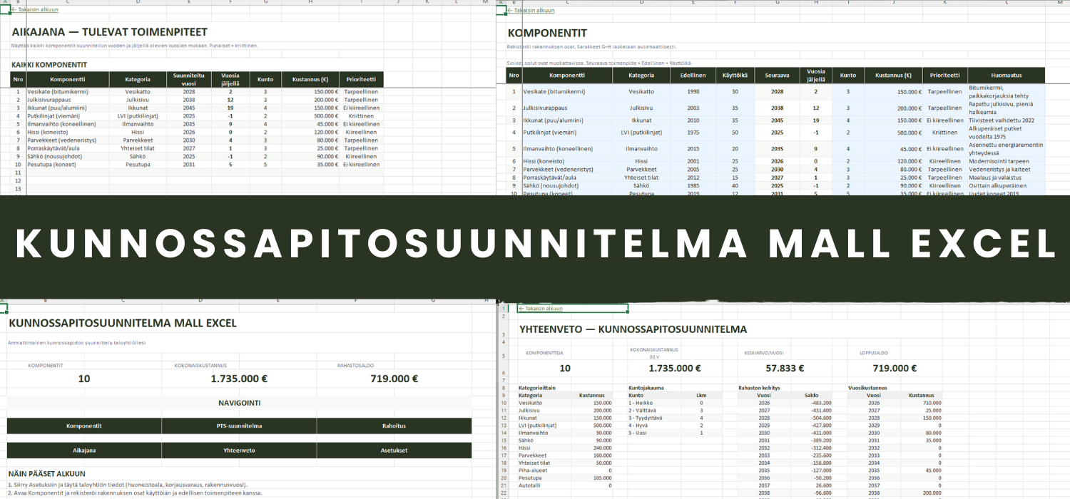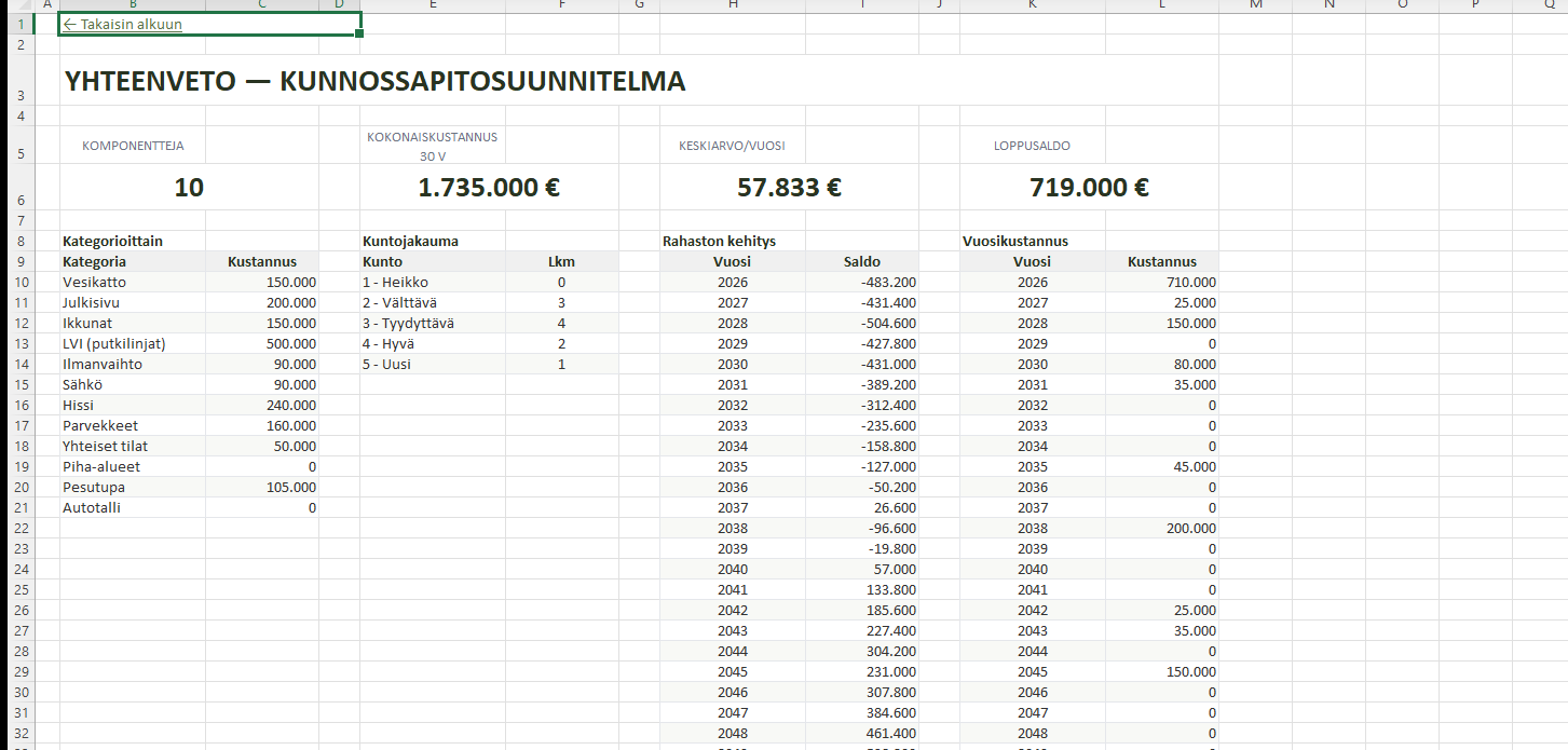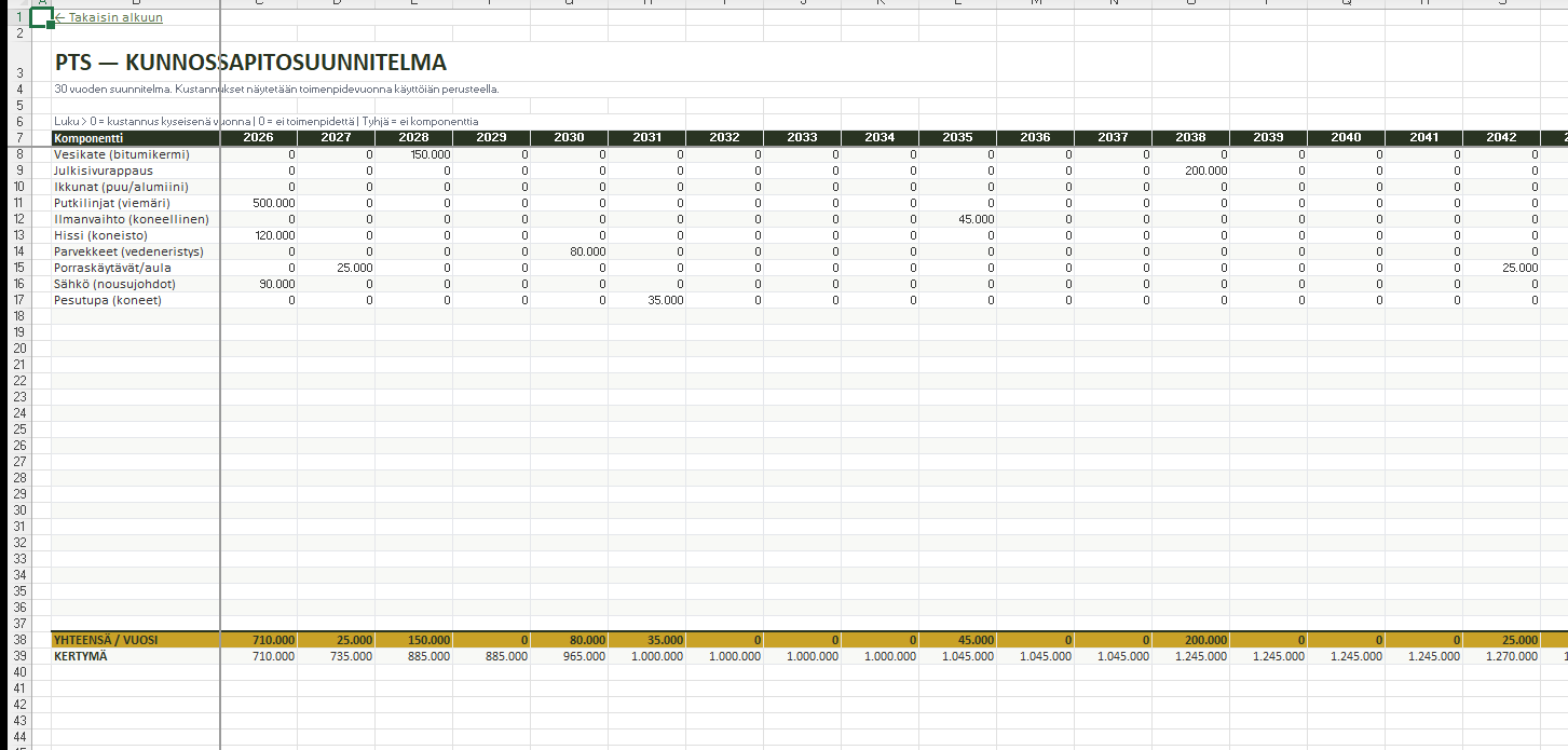 Suomen kattavin kunnossapitosuunnitelma Excelissä asunto-osakeyhtiöille. Suunnittele kiinteistön kunnossapito 30 vuodeksi eteenpäin automaattisella kustannuslaskennalla, rahastoennusteella ja kattavuusasteella, komponenttiluettelolla kuntoluokituksella sekä dashboardilla 4 kaaviolla – kaikki yhdessä Excel-tiedostossa yli 1 600 kaavalla.