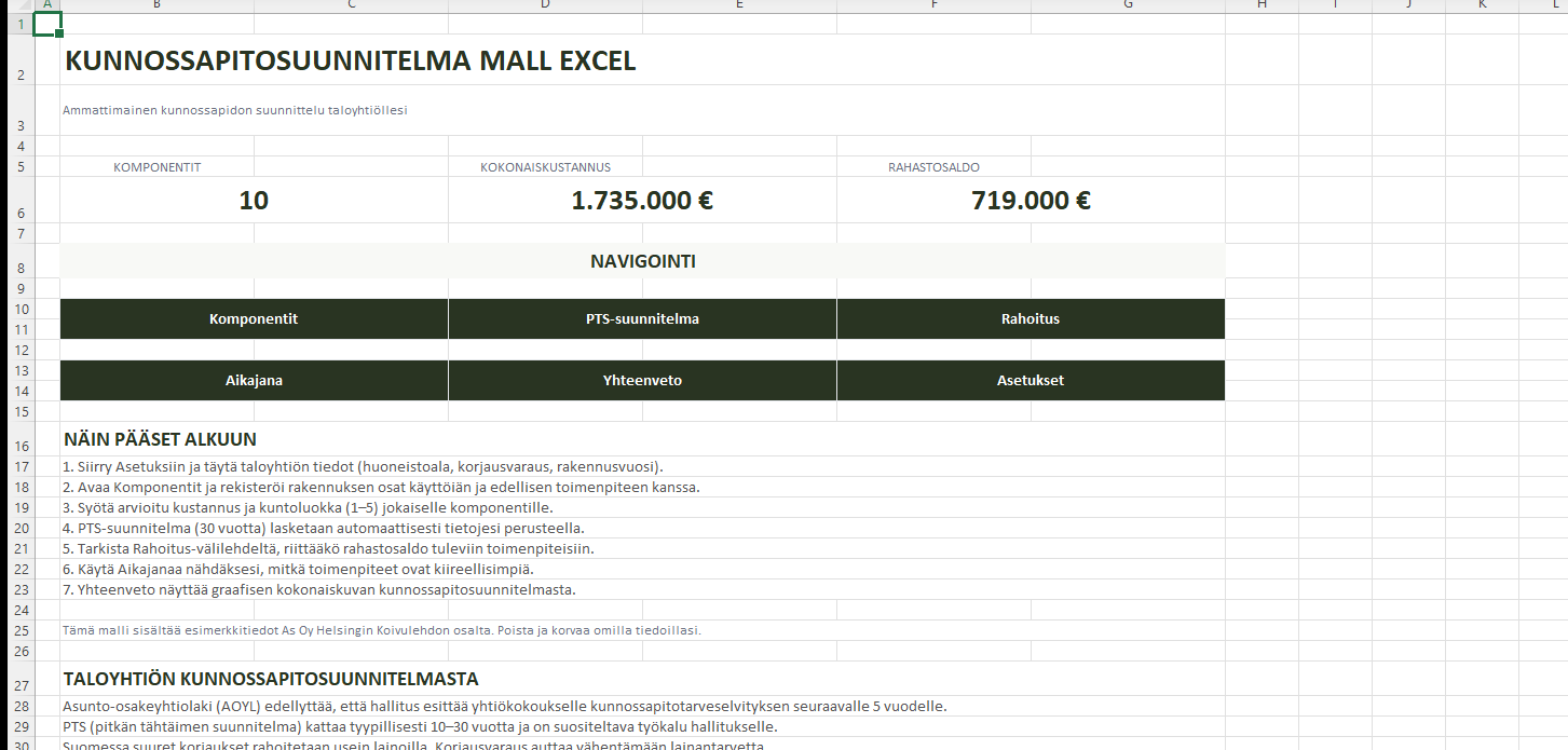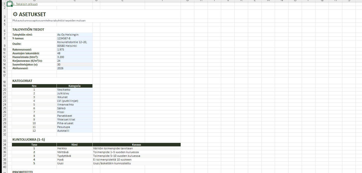 Tärkeää tietoa: Tämä pohja on tukityökalu kunnossapidon suunnitteluun eikä korvaa ammattimaista kuntoarviota. Hallituksen vastuulla on varmistaa, että kunnossapitosuunnitelma täyttää asunto-osakeyhtiölain vaatimukset kyseiselle kiinteistölle.